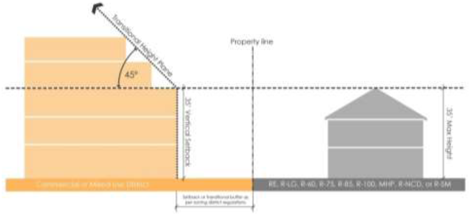 Transitional height plane means a geometric plane that establishes the maximum permitted height of a building in a district that allows a greater density than that of an adjoining lower-density residential district. The transitional height plane shall begin at a point 35 feet above setback or transitional buffer line, whichever is furthest from the property line, then extend at an upward angle of 45 degrees over the lot of the building.