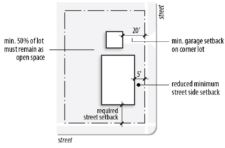 Nonconforming lots in residential zoning districts. In residential zoning districts, a single detached house may be erected on a nonconforming lot without complying with the minimum lot area, minimum lot area per unit, minimum lot width, minimum street frontage or minimum open space per unit requirements of the subject zoning district, provided that at least fifty (50) percent of the lot area remains as open space. All other lot and building regulations apply, except that detached houses may be erected on corner lots that are nonconforming with regard to lot width, subject to a reduced minimum street side building setback of five (5) feet. Garages that are accessed through a side yard abutting a street must be set back at least twenty (20) feet.