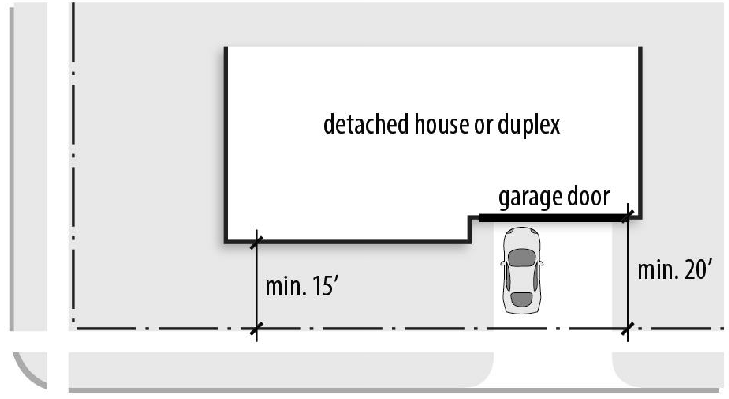 For detached houses and duplexes on corner lots, the minimum side street setback along a non-arterial street may be reduced to 15 feet, provided that the minimum setback for street-facing garage doors is 20 feet or 20 feet from the back of the sidewalk, whichever is greater. The street setback specified in Table 5-3 applies along the other street.