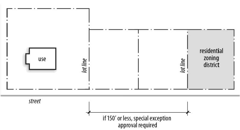Proposed use requires special exception approval if selling or serving alcoholic beverages and located on a lot within 150 feet of any residential zoning district other than R-zoned street right-of-way (see Figure 10-1).