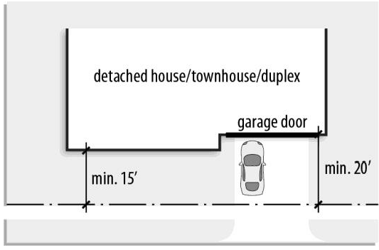 Garage doors must be set back at least twenty (20) feet from back of sidewalk (see Figure 10-7).