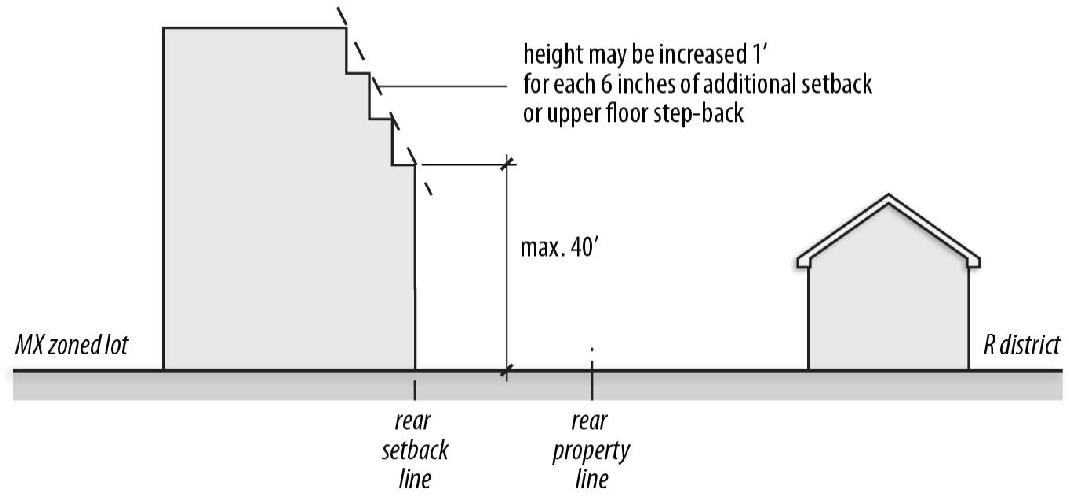 Height transition. For MX-zoned lots that abut an R-zoned lot, the maximum building height limit at the point of the required minimum setback is forty (40) feet. Height may be increased above forty (40) feet by up to one foot (vertical) for each six (6) inches of additional building setback, up to the maximum height allowed in the district. The additional setback may be provided for the entire building or only the portion of the building above forty (40) feet in height (see Figure 10-8).