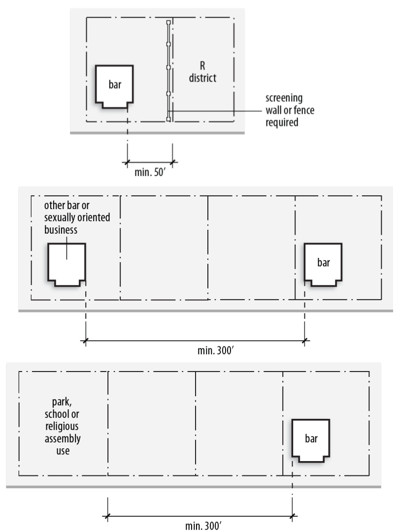 Public entrance doors of bars may not be located within fifty (50) feet of any R-zoned lot, as measured in a straight line from the nearest point on the R-zoned lot (not including R-zoned expressway right-of-way) to the nearest public entrance door of the bar or the nearest portion of any outdoor seating/dining area, whichever results in a greater setback.