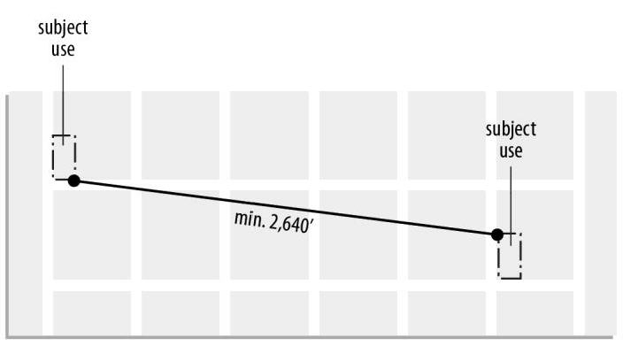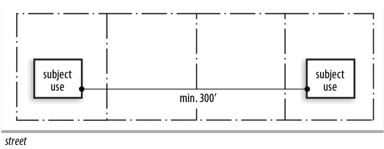 To avoid over-concentration, all detention and correctional facilities, emergency and protective shelters, homeless centers, residential treatment centers and transitional living center uses must be separated from one another by a minimum distance of two thousand six hundred forty (2,640) feet, as measured in a straight line from the nearest point on the lot line of the property occupied by one of these uses to the nearest point on a lot line of the other property occupied by one of the subject uses (see Figure 40-6). The separation distance requirements of this subsection may be reduced if approved through the special exception approval process.