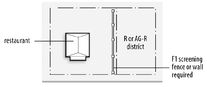 Whenever a commercial services use is located on a lot abutting an R- or AG-R-zoned lot, a screening wall or fence must be provided along the common lot line in accordance with the F1 screening fence or wall standards of Subsection 65.070C.