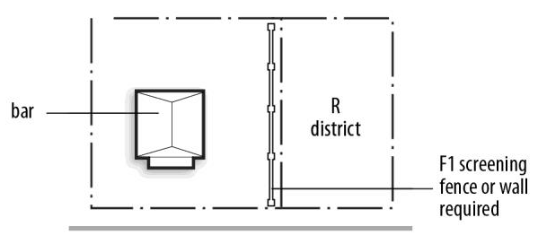 When a bar is located on a lot abutting an R-zoned lot, a screening wall or fence must be provided along the common lot line in accordance with the F1 screening fence or wall standards of Subsection 65.070C.