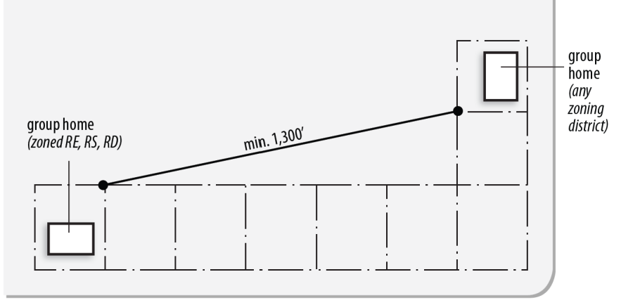To avoid over-concentration, community group homes in RE, RS or RD zoning districts may not be located within one thousand three hundred (1,300) feet of any other community group home. This separation requirement is established, not on the basis of any disability status, but on the basis of the non-family status of the groups. The required separation distance must be measured in a straight line from the nearest lot lines of the lots occupied by the community group home uses.
