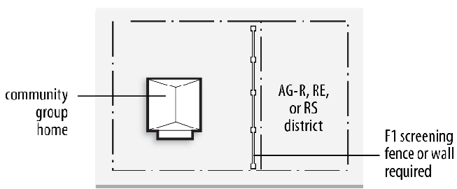 When a community group home is located on a lot abutting an RE-, RS-, or AG-R-zoned lot, a screening wall or fence must be provided along the common lot line in accordance with the F1 screening fence or wall standards of Subsection 65.070C.