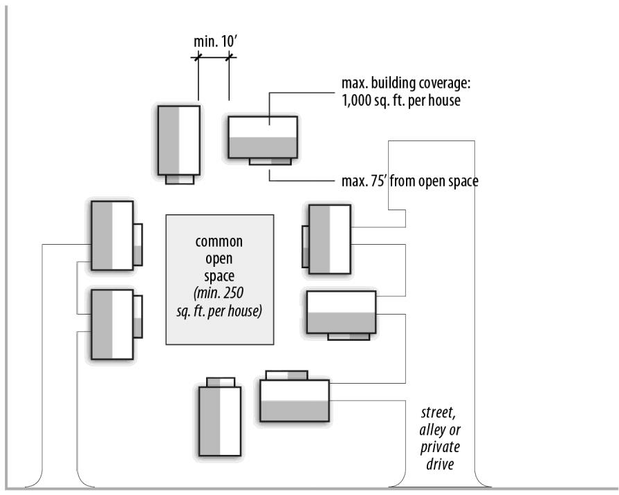 Required courtyards and common open space areas must have cottage houses abutting on at least two (2) sides.