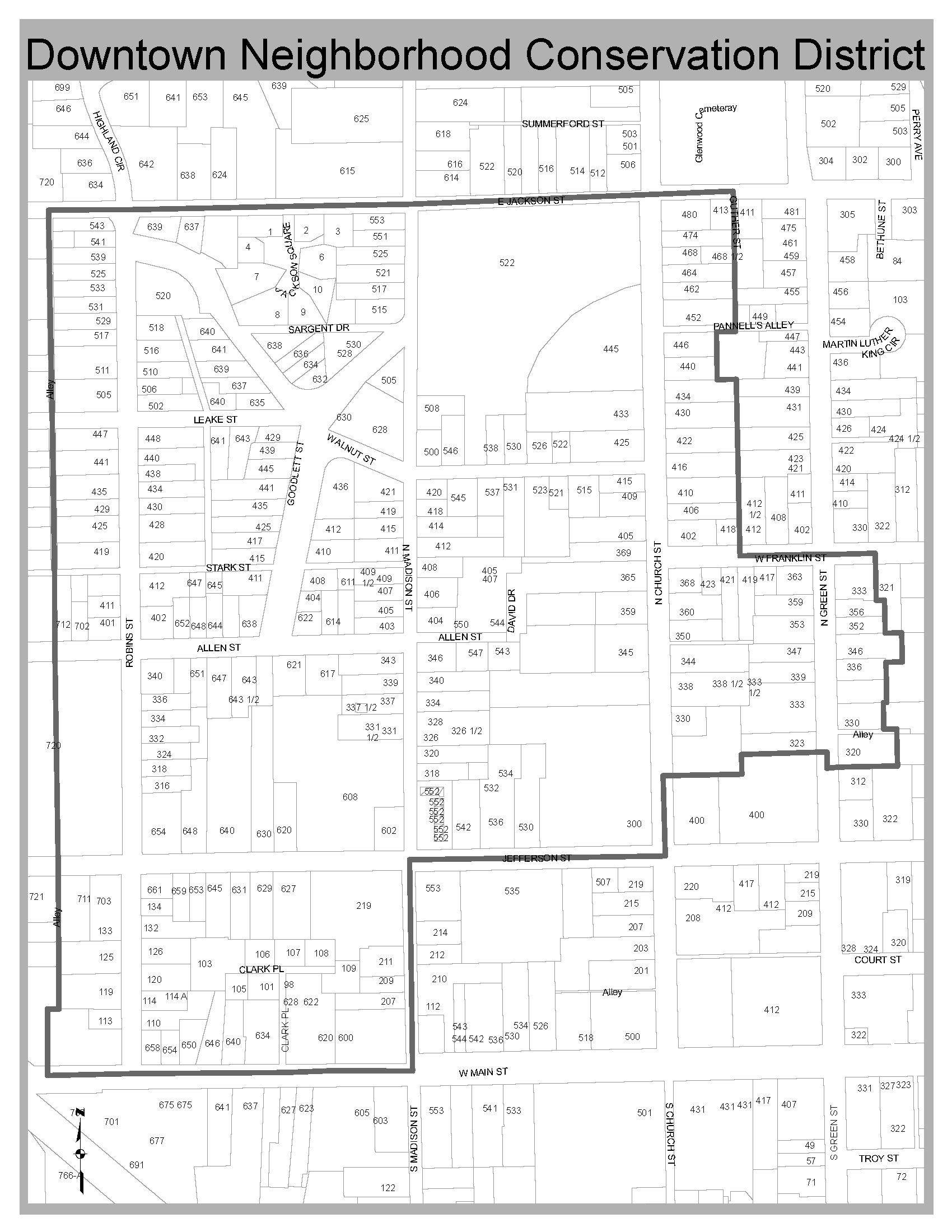 Applications for construction or renovation within the Historic Downtown Neighborhood Conservation Overlay District shall be accompanied by complete drawings of the proposed work, including a site plan, floor plan, full elevation drawings, and exterior materials list.