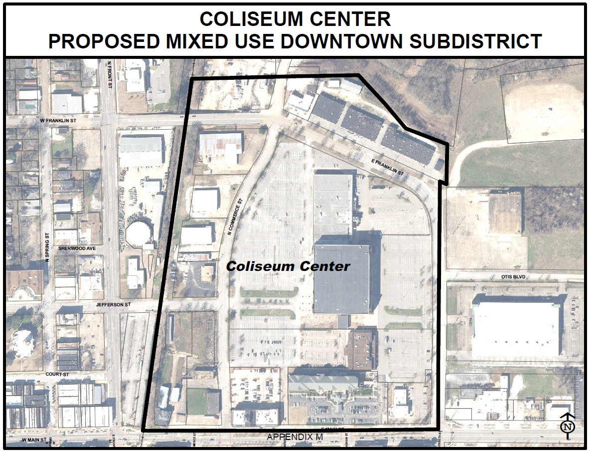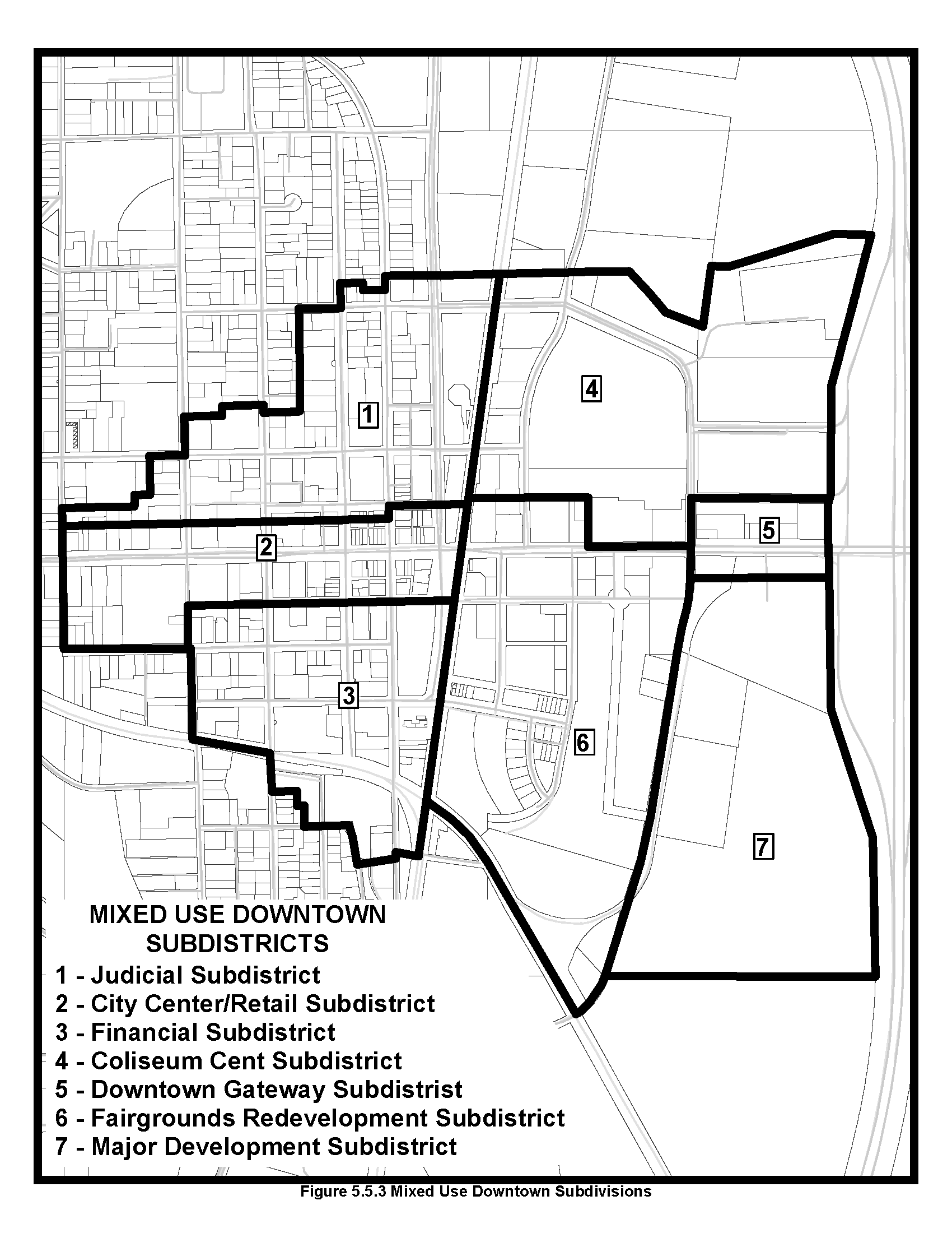 Coliseum Sub-district: Development around the coliseum complex to support pedestrian connection to tourism resources, event spaces, and unique professional services, convenience, lodging, educational establishments;