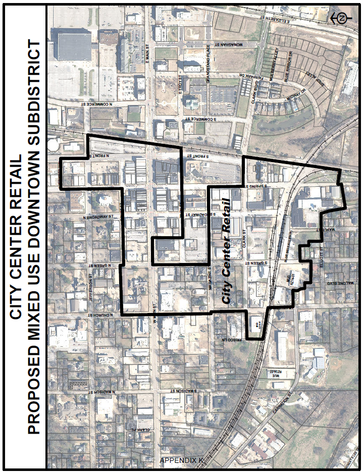 City Center Retail Sub-district: Major daytime and evening pedestrian circulation route intended to draw retail, restaurant, and entertainment clustering and upper story residential development to gain additional pedestrian activity alongside artistically and historically significant structures and communities;