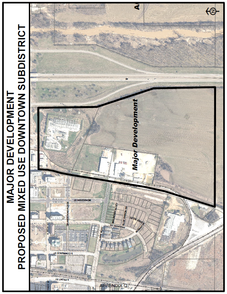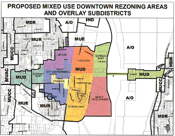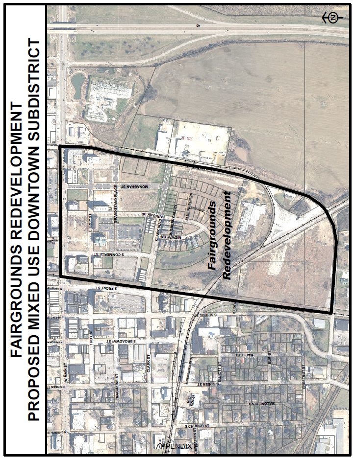 Fairground Redevelopment Sub-district: Redevelopment district providing unique single family and upper story residential opportunities alongside government, professional, retail, restaurant, and pedestrian centric services;