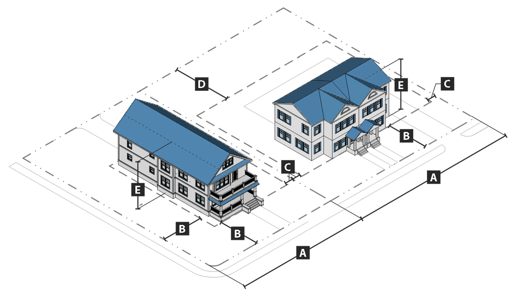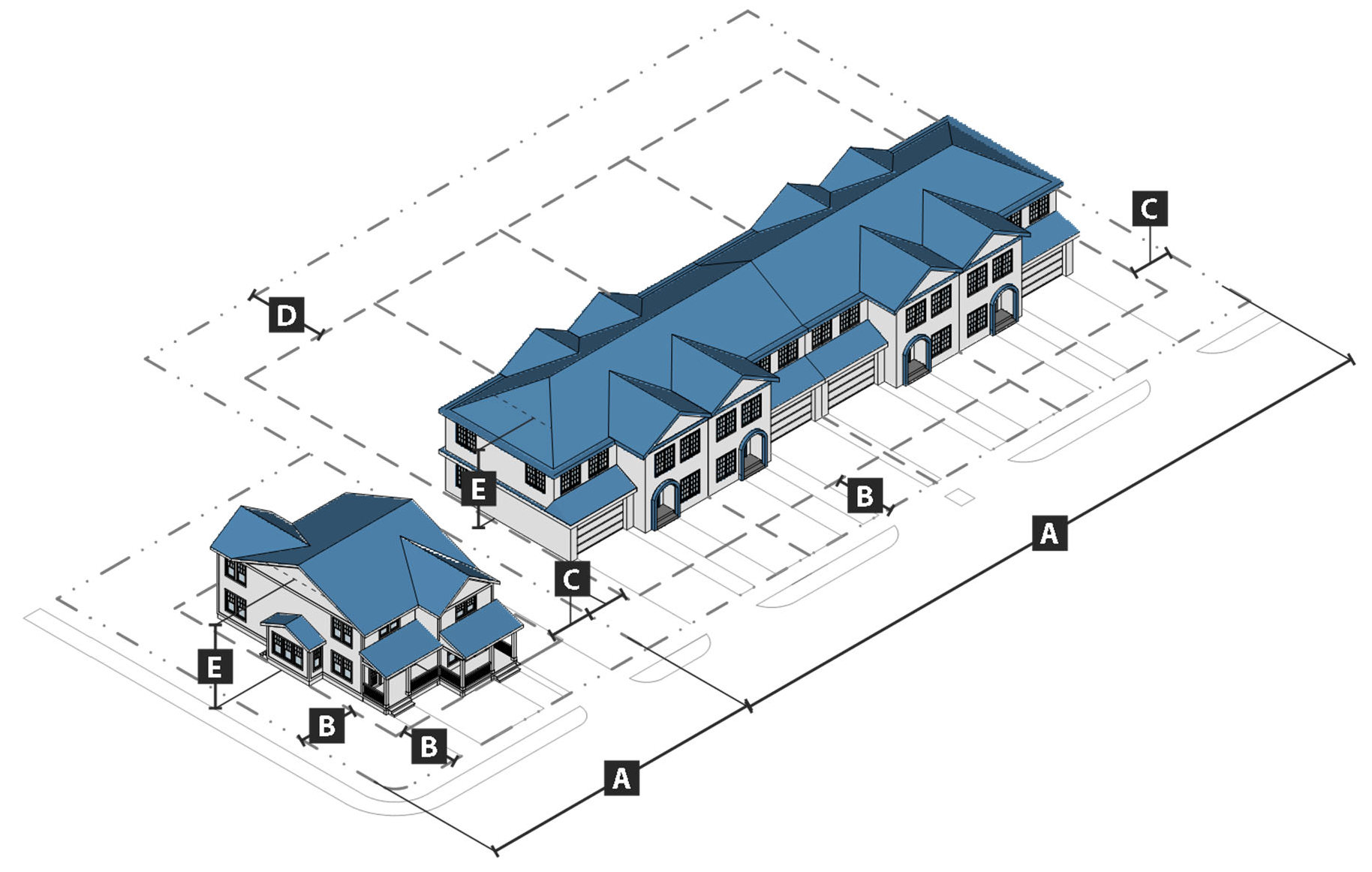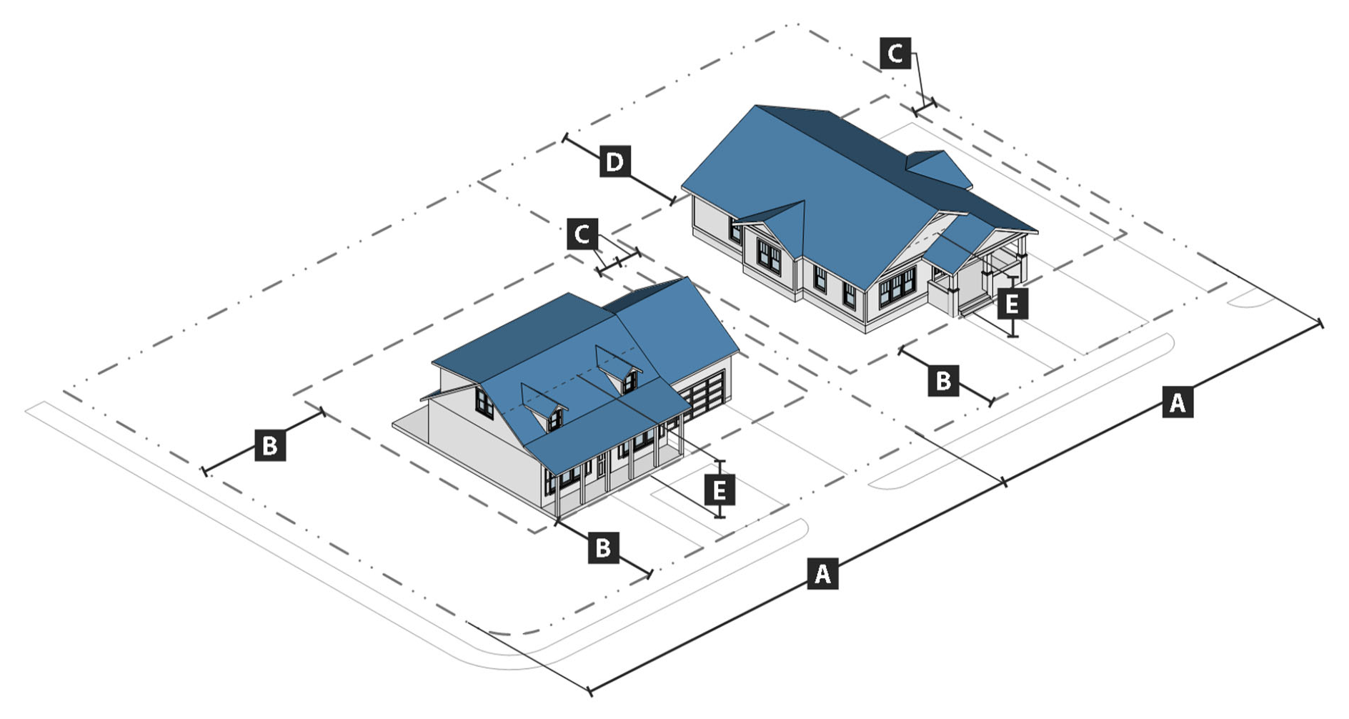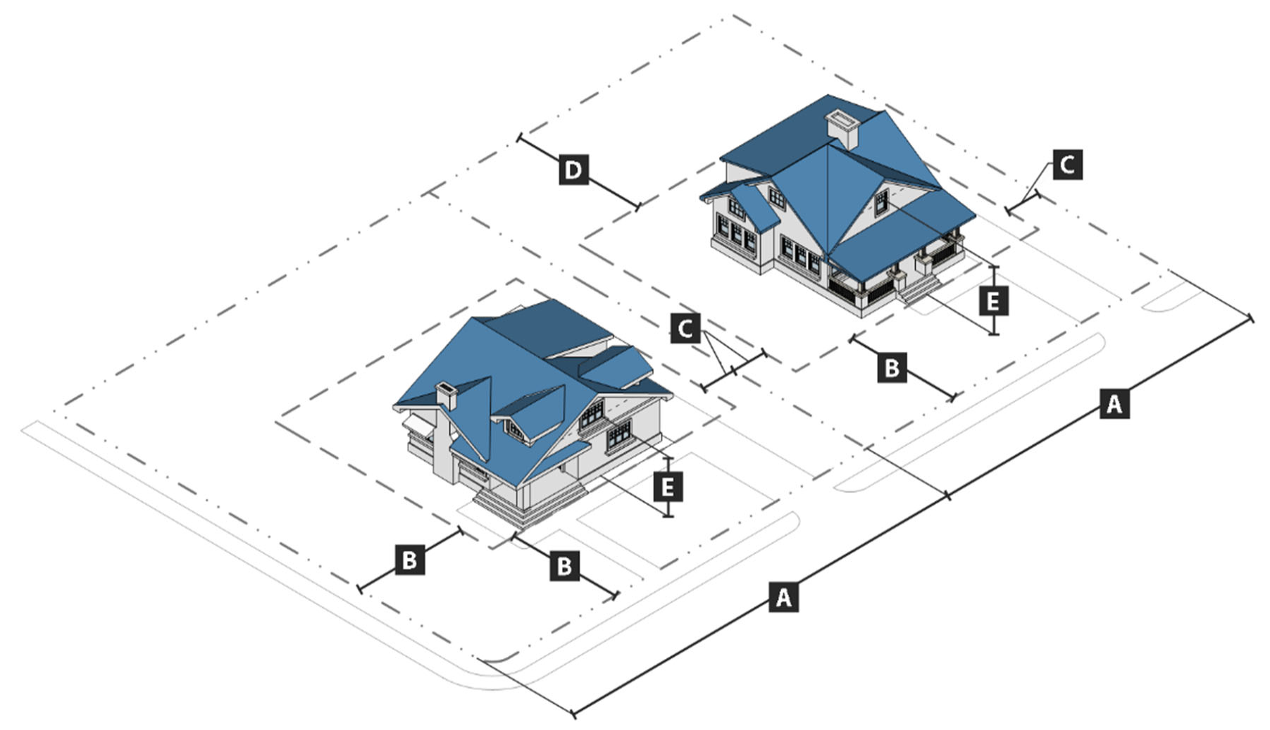 [3] Except the lot width for a lot for single-family detached dwellings shall be a minimum of 45 feet at the building line, have a minimum front setback of 20 feet, and a minimum side setback of four feet. All lots designed for duplex units shall meet the same standards as those for single family detached dwellings, except that a zero setback along the common wall between units is allowed. All townhouse or other similar attached units shall provide a minimum front setback of 20 feet.