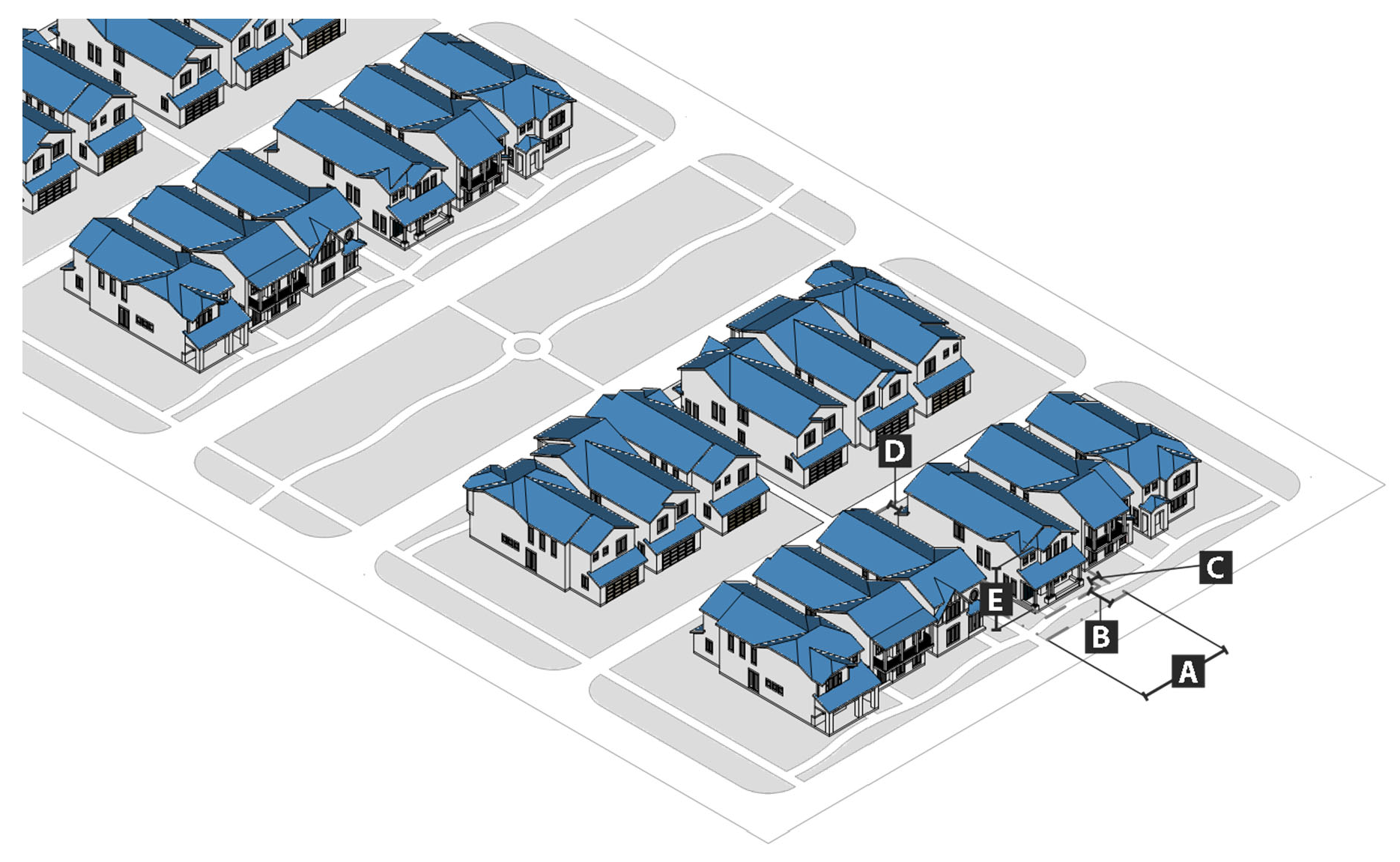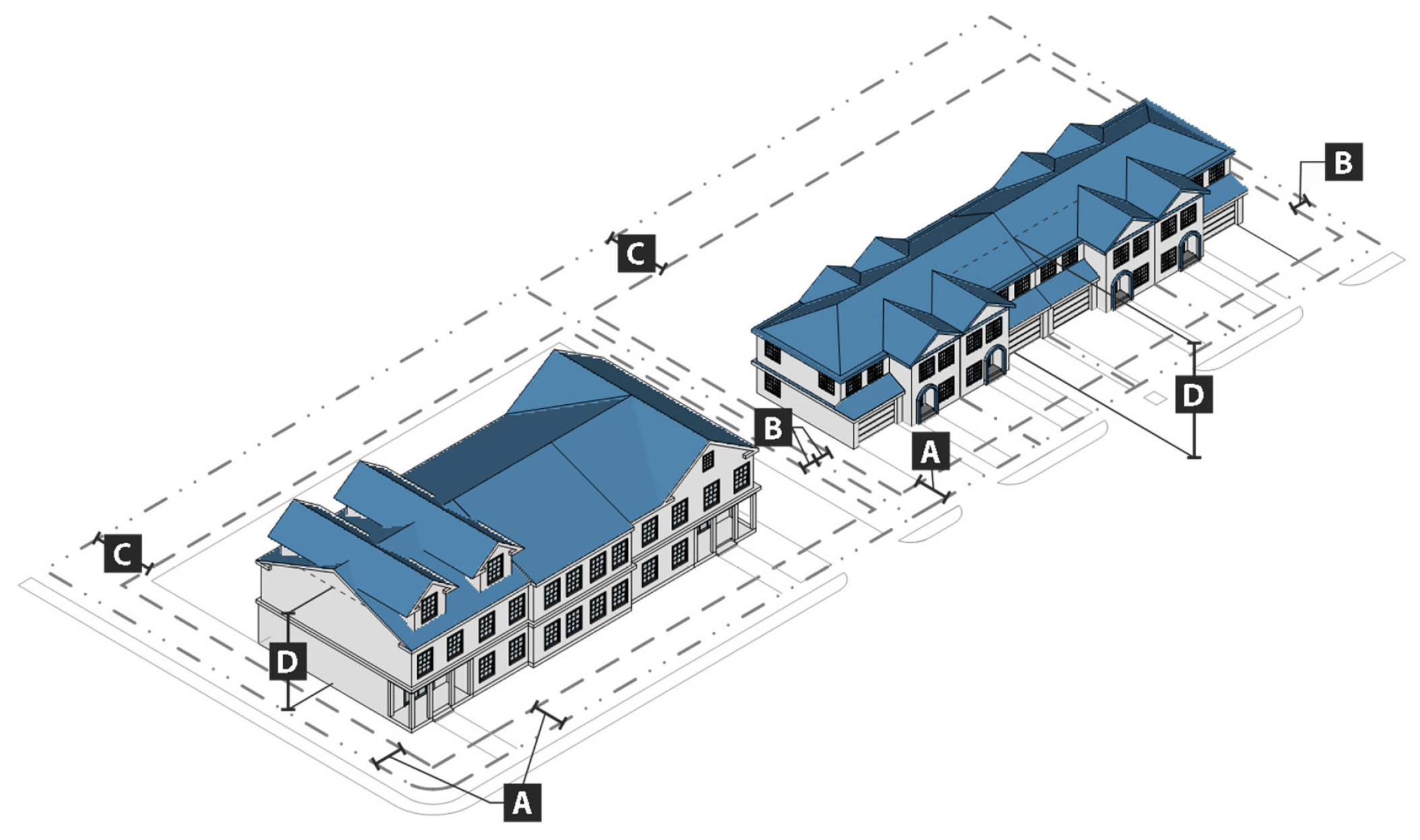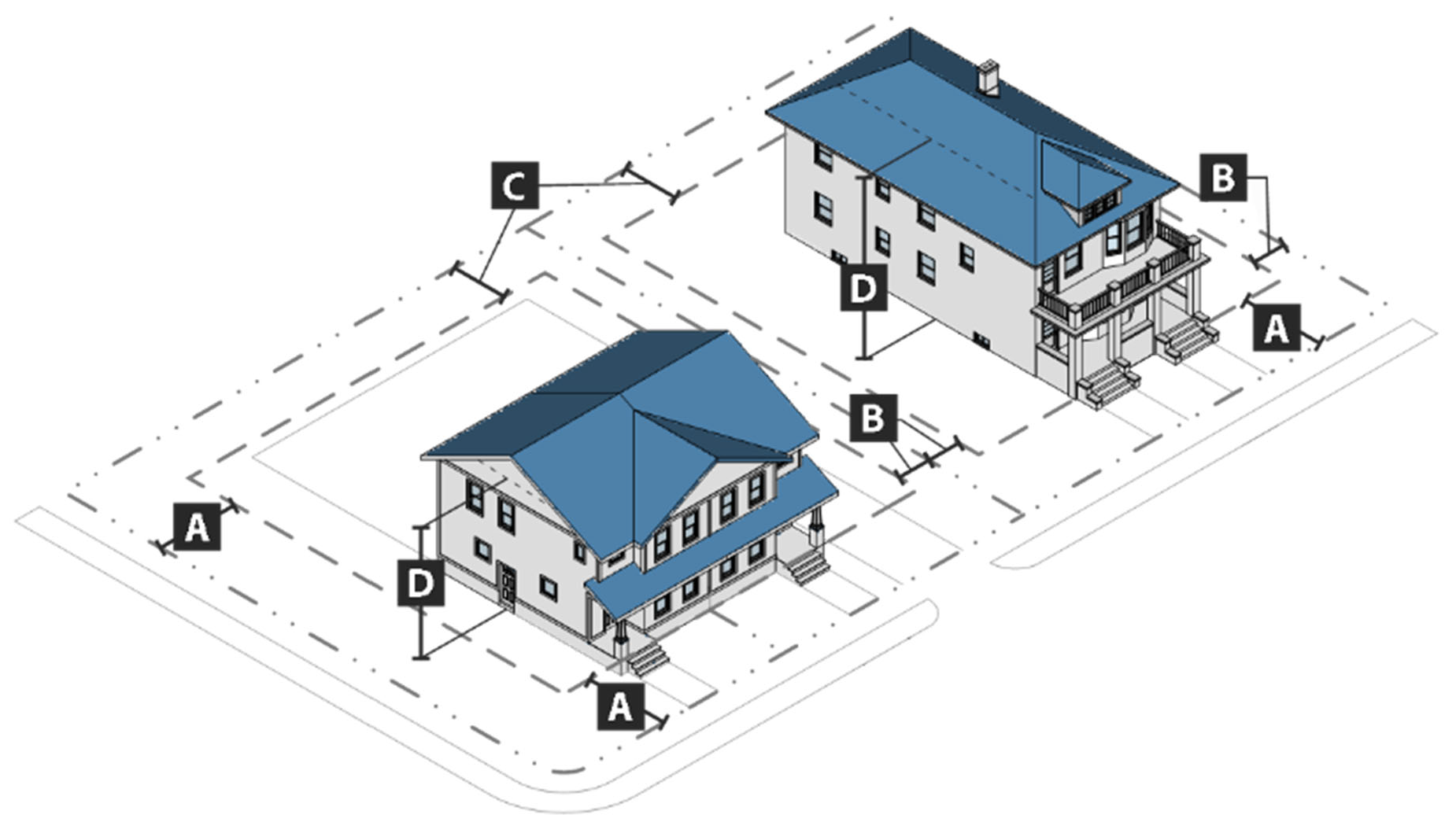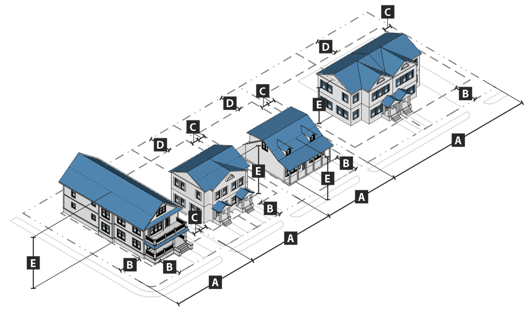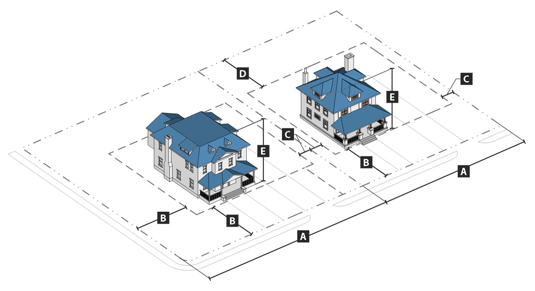 [3] Except the lot width for a lot for single-family detached dwellings shall be a minimum of 45 feet at the building line, have a minimum front setback of 20 feet, and a minimum side setback of four feet. All lots designed for duplex units shall meet the same standards as those for single family detached dwellings, except that a zero setback along the common wall between units is allowed. All townhouse or other similar attached units shall provide a minimum front setback of 20 feet.