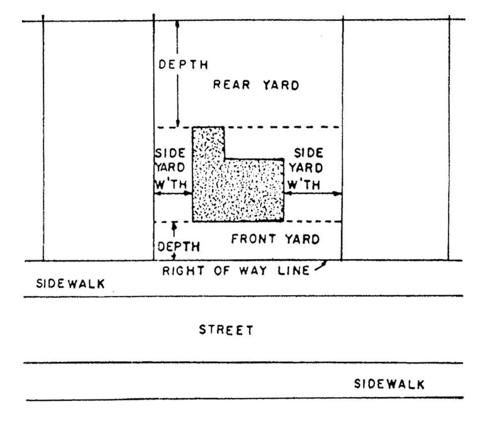 That area of a lot lying between the abutting street right-of-way line and the principal building of the lot, and extending across the front of a lot from side lot line to side lot line. (See illustration, page 9 [following this definitions section].)