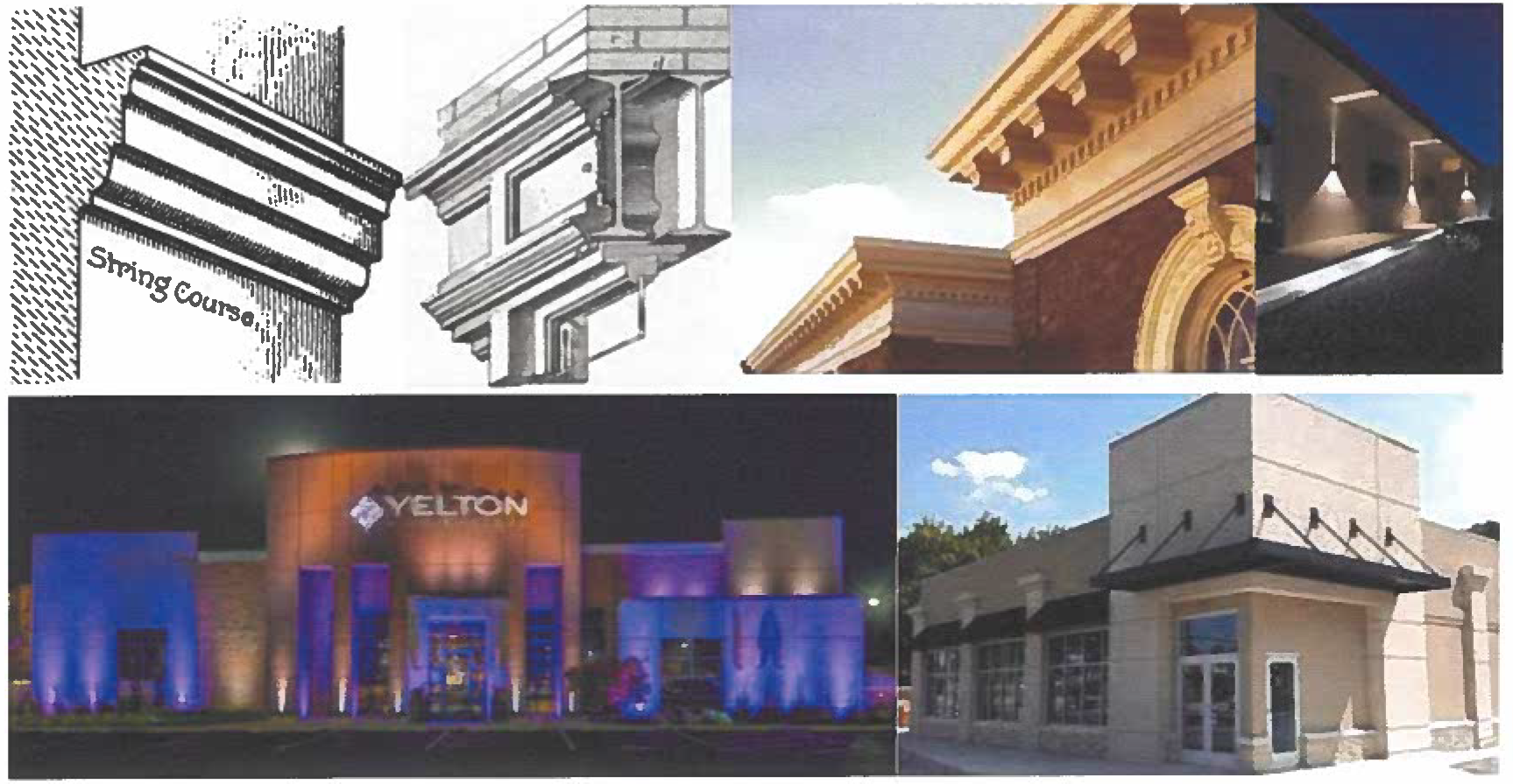 Decorative string course, must be a minimum of eight inches wide and extend the entire length of the building walls.