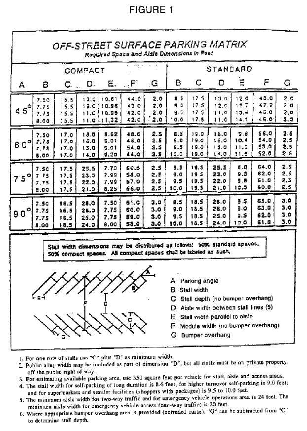 Space size. Each off-street parking space shall have a net area of not less than 180 square feet, exclusive of access drives or aisles, and shall be designed to the dimensional requirements of Figure 1, Section 10-9-6 of this chapter. If determined on a gross area basis, 280 square feet shall be allowed per vehicle. Parking spaces shall be identified with painted stripes or other permanent markings.