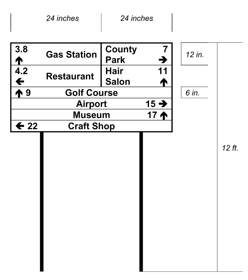 To ensure that the sign serves only a directional purpose, it shall contain only the name of a place, business or facility, distance and direction arrow to the place, business or facility and may not also be used to advertise. See examples in this subsection.