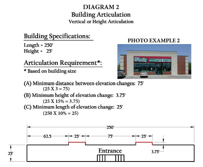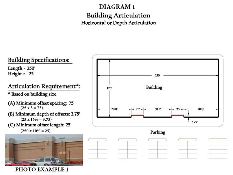 In order to ensure an interest in design and provide building articulation to the façade of a building, a variety of building techniques are required. It is the intent of these design criteria to ensure that the front and sides, and in certain instances the rear, of non-residential and multi-family structures have a variety of offsets, relief, and insets to provide a more aesthetic façade appearance.