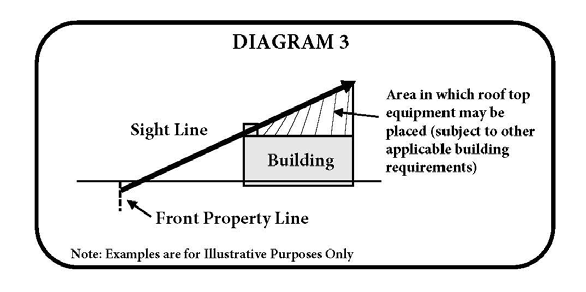 If a sight line drawing is provided with the site plan showing that all roof top equipment will not be visible from the public right-of-way or adjacent property, then a parapet wall or other façade articulation shall not be required. See Diagram 3.