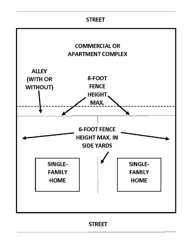 Fences in residential districts abutting a commercial district or multi- family residential district with more than eight (8) attached dwelling units shall be allowed to be installed on the property line abutting the commercial or multi-family residential district at a height not to exceed eight (8) feet. This shall also apply when an alley is situated between the residential property and commercial or multi-family property.