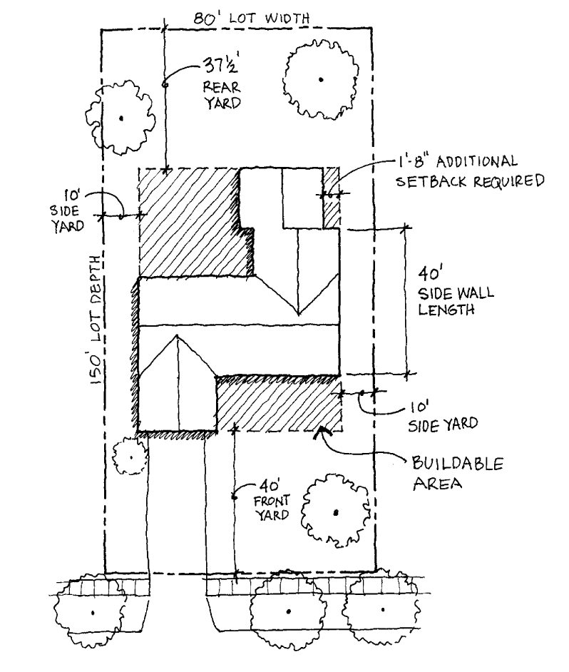 Side yard modification: Beginning at the front face on the building, each side yard, where required, shall be increased in width by two (2) inches for each foot by which the elevation length of the building, adjacent to the side yard, exceeds forty (40) feet. Adjacent in this context means any portion of the side wall that is closer to the side property line than twenty-five percent (25%) of the lot width at the place of measurement. In no case, other than corner lots shall the total elevation length of the side wall of a principal structure exceed fifty percent (50%) of the average lot depth, or the depth.