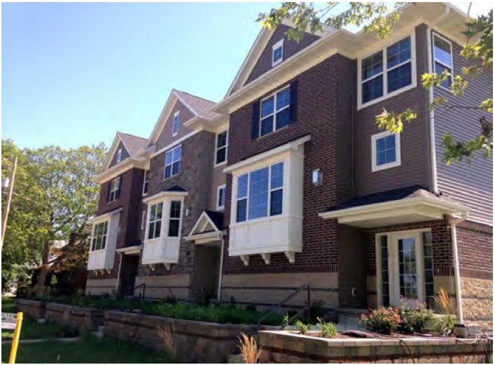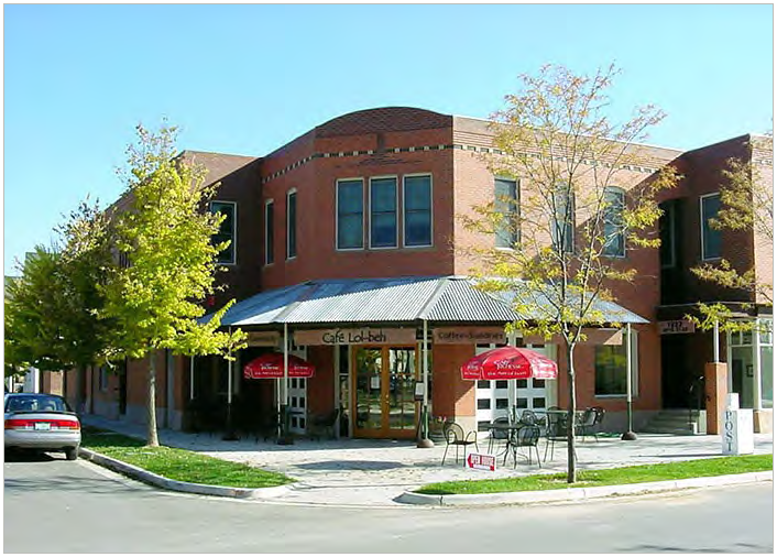 "Block-form" buildings with simple massing and flat roofs, which are intended primarily for the Town Center (TC) and Industrial (IND) zones. Such buildings are larger than houses, are built close to the sidewalk, and have a small or no side yard set-backs; and