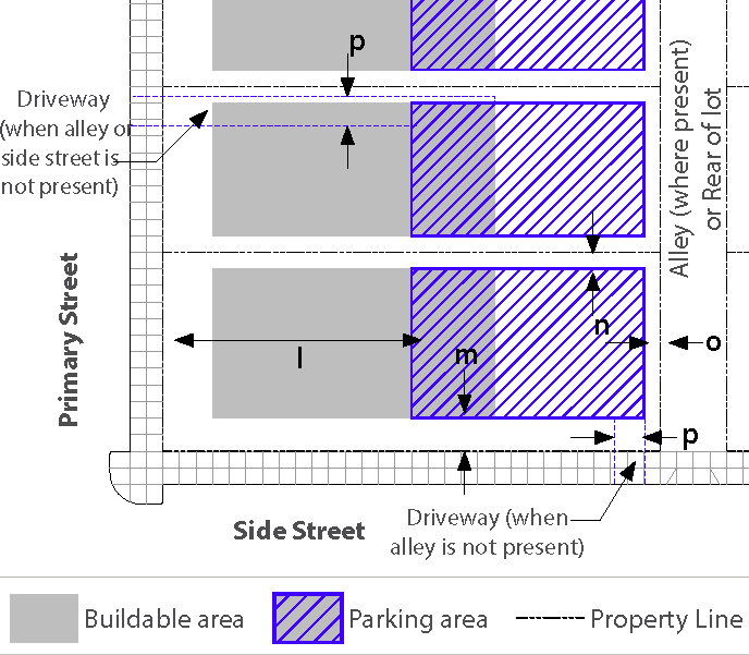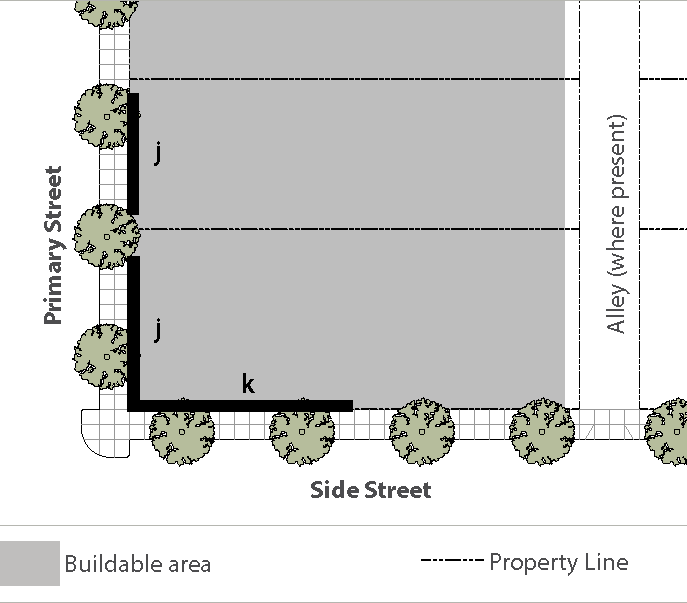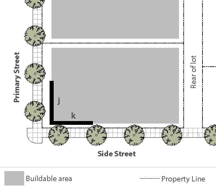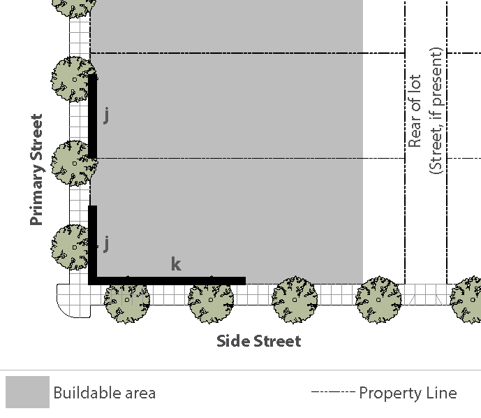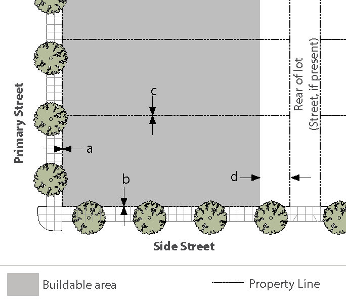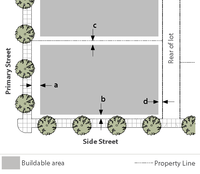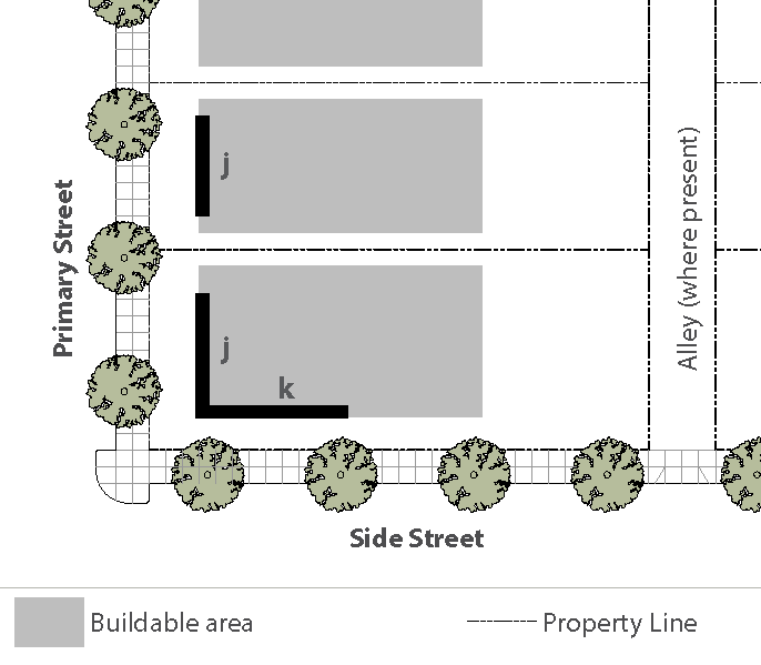 Standards: Whenever feasible, apply the "rear" standards (frontage, setback, etc.) for the side of a lot that abuts the railroad. When the primary street for the lot is L.A. Avenue or Alelia Avenue, and the "rear" lot standards is not feasible, use the "side street" standards for the side of a lot that abuts the railroad.