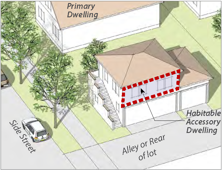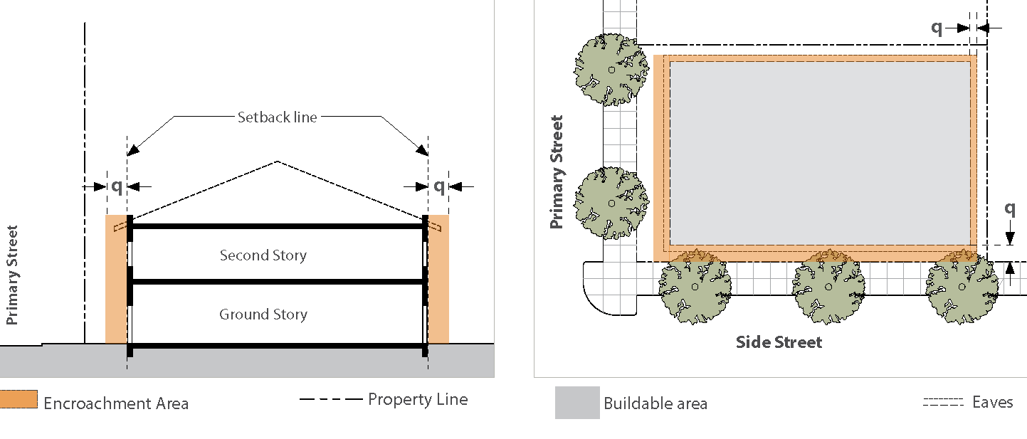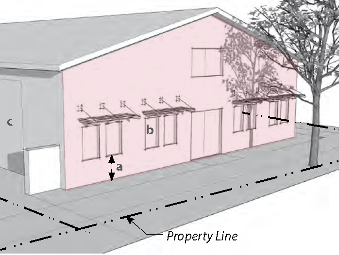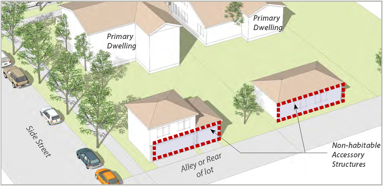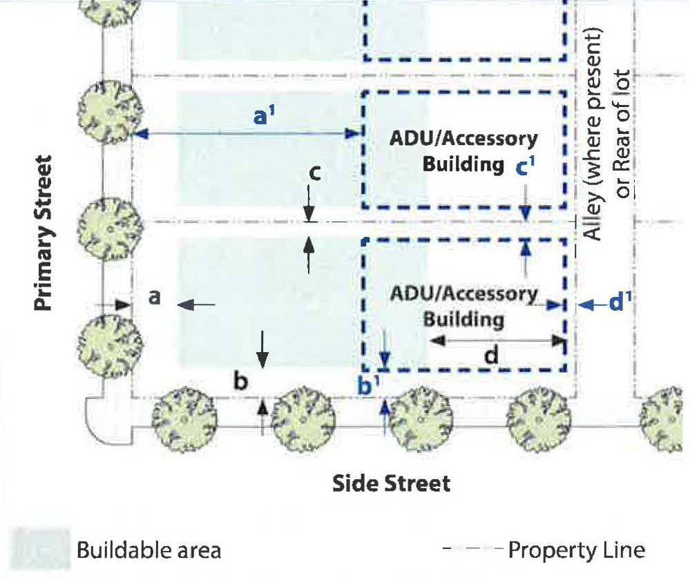 Standards: Whenever feasible, apply the "rear" standards (frontage, setback, etc.) for the side of a lot that abuts the railroad. When the primary street for the lot is L.A. Avenue or Alelia Avenue, and the "rear" lot standards is not feasible, use the "side street" standards for the side of a lot that abuts the railroad.