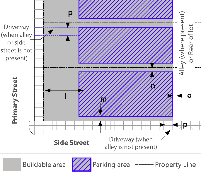 Vehicular Access: On-site parking shall be accessed from new internal streets, existing alleys, or the "side street" for that lot. Direct access to on-site parking from SR 118 or the "primary street" is prohibited unless alternative access is not feasible.