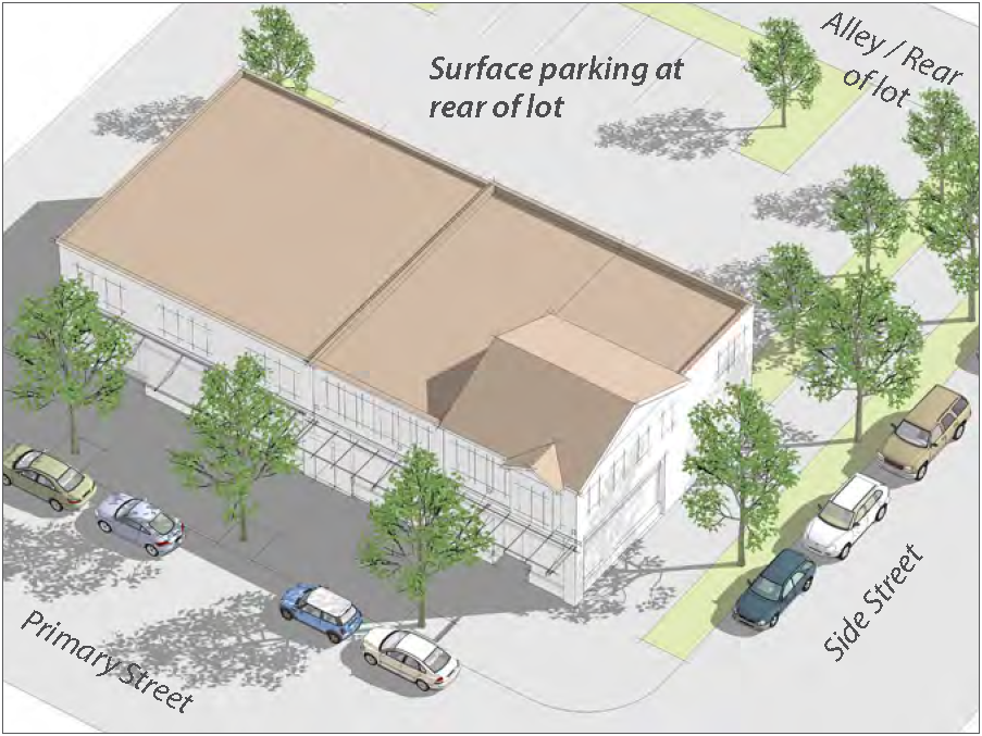 Parking placement should occur within the lot interior or, alternatively, adjacent to the railroad right-of-way.