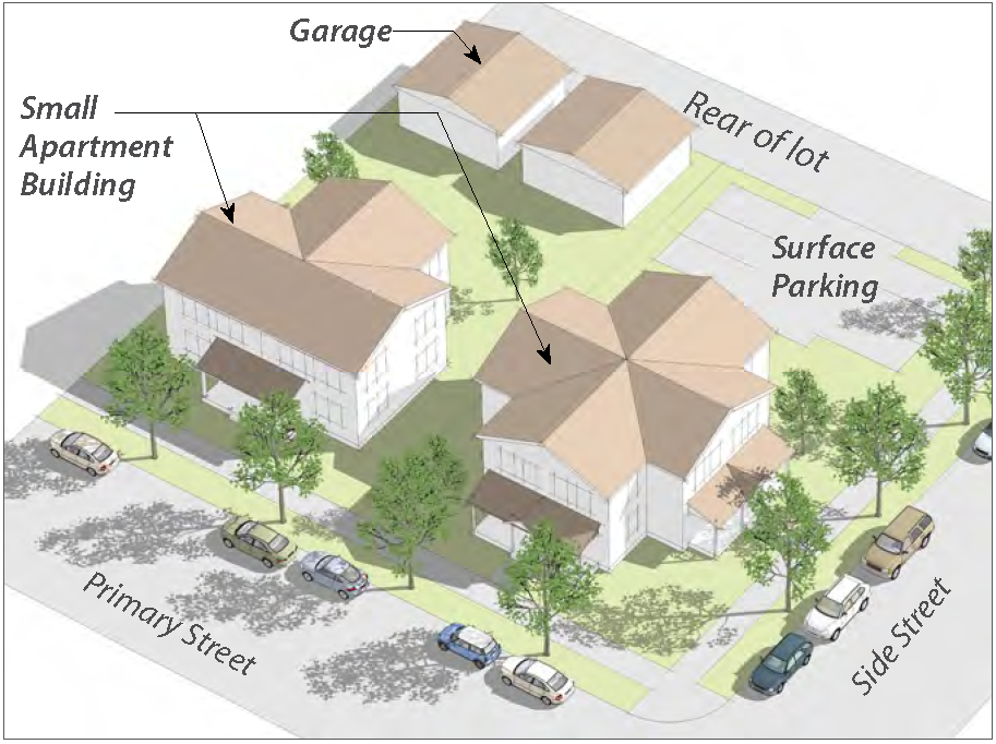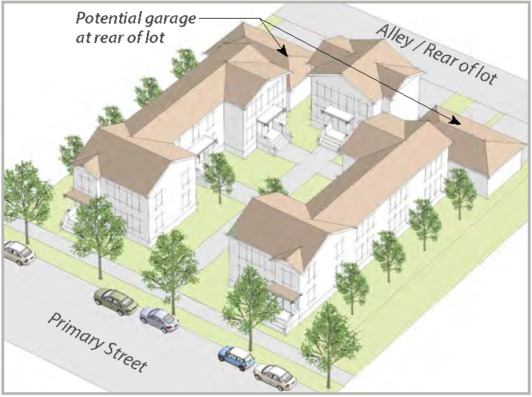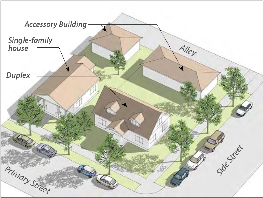 "House-form" buildings with the scale, shape and size of houses range from individual houses to buildings composed of attached or detached dwellings. House-form buildings that contain multiple units (such as duplexes, triplexes, and quadplexes) use the same form as a large house.