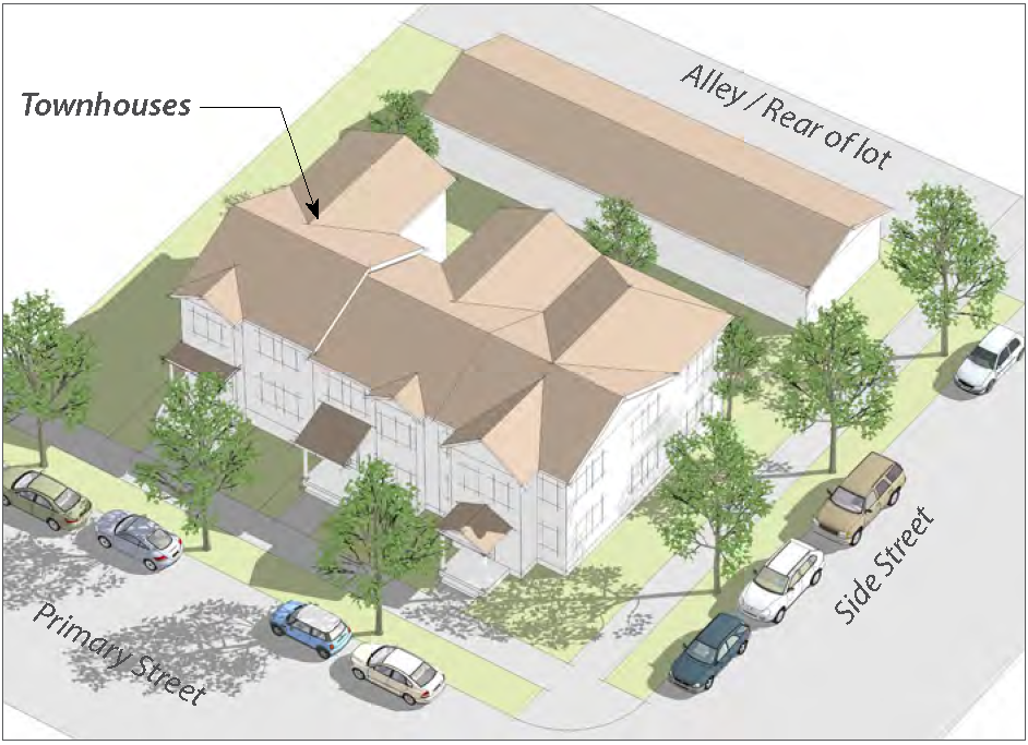 Frontage types are not required, although main entrances should face the street and both street- and alley-facing windows are required.