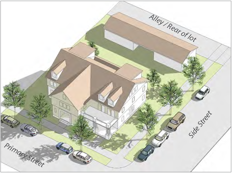 Buildings should generally be placed at the front of the lot for interior lots and at the corner of the lot for corner lots, although other placements may be allowed if required by the use.