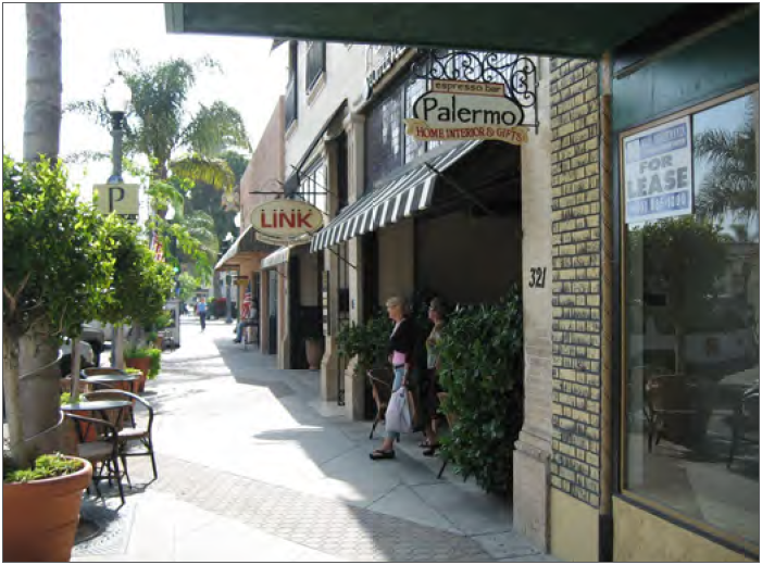 Create a pedestrian-oriented environment. Provide building standards that place entries close to the adjacent public street and signage that provides information on services or products available within that building.