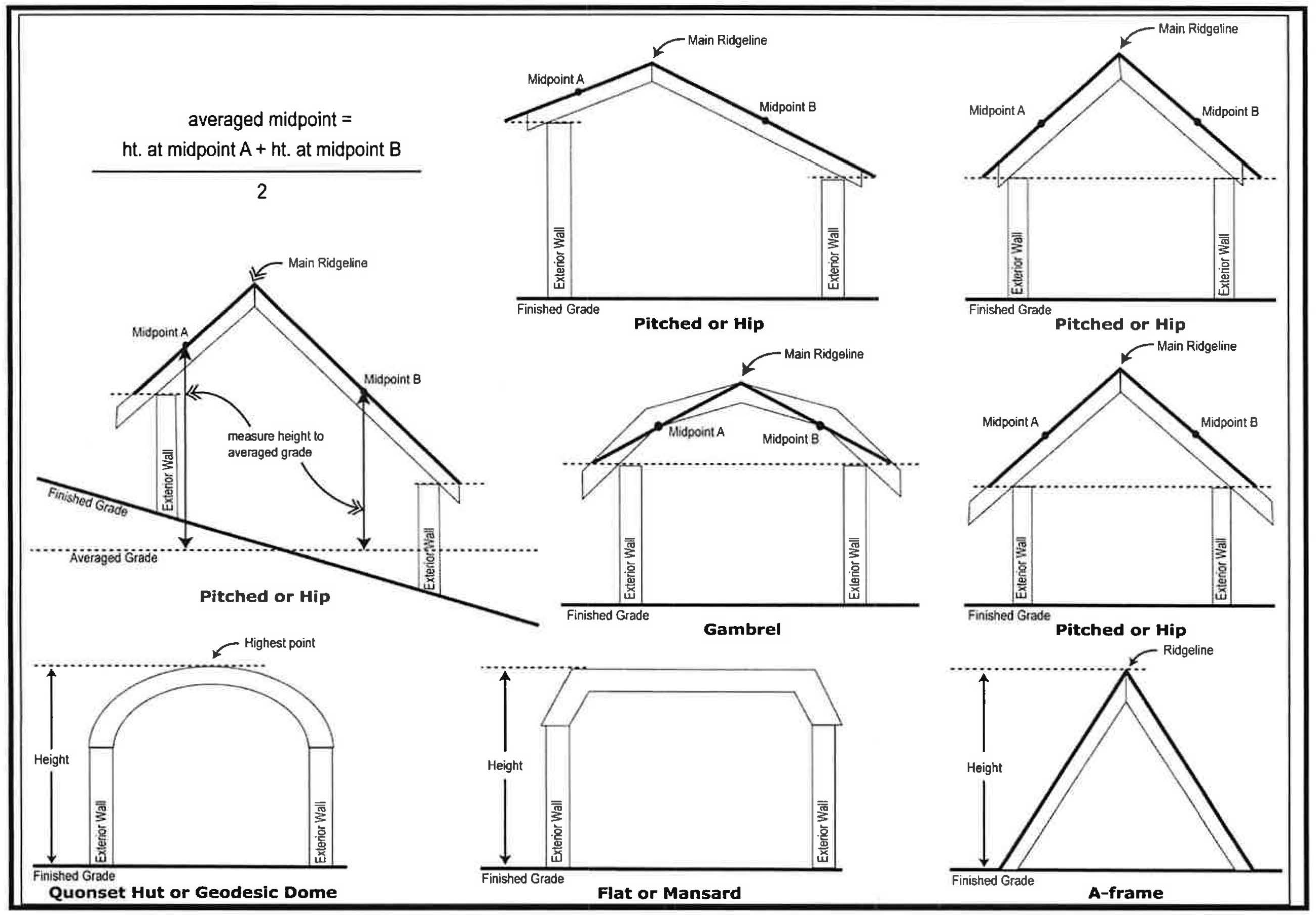 The height of any building located on a flat grade is the vertical distance from the grade to the highest point of the roof; this includes A-frame buildings, Quonset huts, geodesic domes and other such buildings that have the roof and walls forming a continuous architectural unit. In the case of a pitched roof, height is measured to the "averaged midpoint" of the roof. This "averaged midpoint" is arrived at by identifying two points ("midpoints") along the roof which are midway between the peak of the highest finished main ridge line(s) and the intersection of the outermost portion of the roof with the upward extensions of the two exterior finished walls running parallel to the main ridge line(s), measuring the distance from these two points to the grade, adding together the two vertical heights from grade to the midpoints, and dividing the result by two.