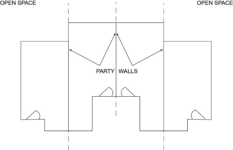 Party wall. A wall which separates portions of a building starting from the foundation and extending continuously through all stories to or above the roof.
