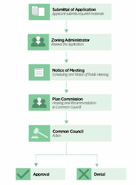 Review and Action by the Common Council. The Common Council shall consider the Plan Commission's recommendation regarding the proposed amendment to the Official Zoning Map. The Council may request further information and/or additional reports from the Plan Commission, the Zoning Administrator, and/or the Applicant. The Council may take final action on the application to the Official Zoning Map at the time of its initial meeting, may continue the proceedings, may approve the amendment as originally proposed, may approve the proposed amendment with modifications (per the recommendations of the Zoning Administrator, the Plan Commission, authorized outside experts, or its own members), or may deny approval of the proposed amendment. Any action to amend the Official Zoning Map requires a majority vote of the Council. The Common Council's approval of the requested amendment shall be considered the approval of a unique request and shall not be construed as precedent for any other proposed amendment.