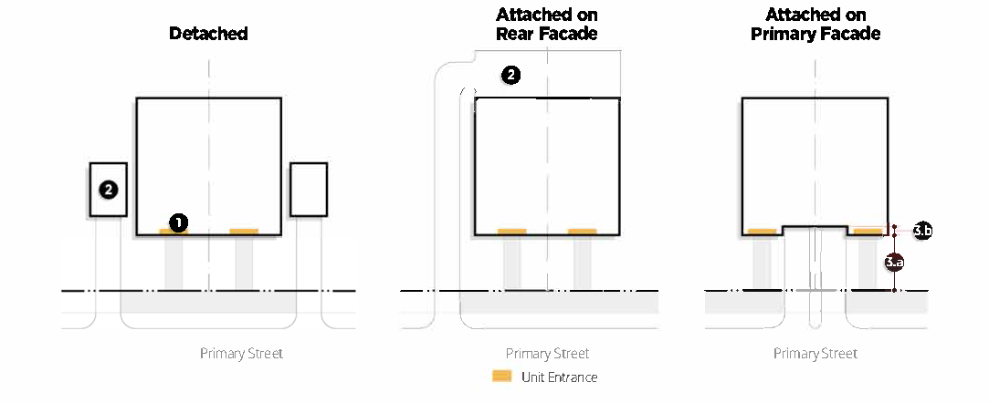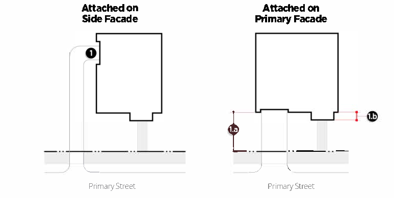Attached garages are encouraged to be located on side façades. If attached garages are located on the primary façade they shall: