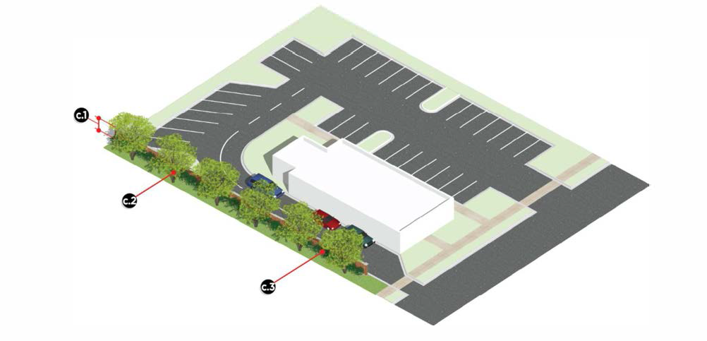 Parking shall be integrated into the overall site design to minimize impact, reduce the loss of trees, and to be visually concealed from rights-of-way.