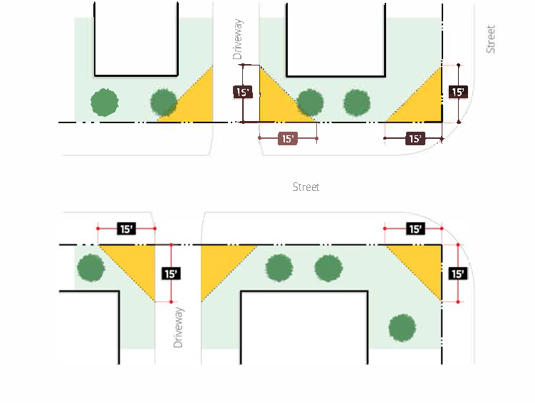 Clear sight distance shall be maintained at the intersection of a driveway and any right-of-way, and at the intersection of two (2) or more streets. No building or structure shall be permitted that creates a visual obstruction taller than three (3) feet in the area of the lot measured as a distance of fifteen (15) feet from the center of the intersection of the driveway and street, or from the center of the intersection of two (2) or more streets.