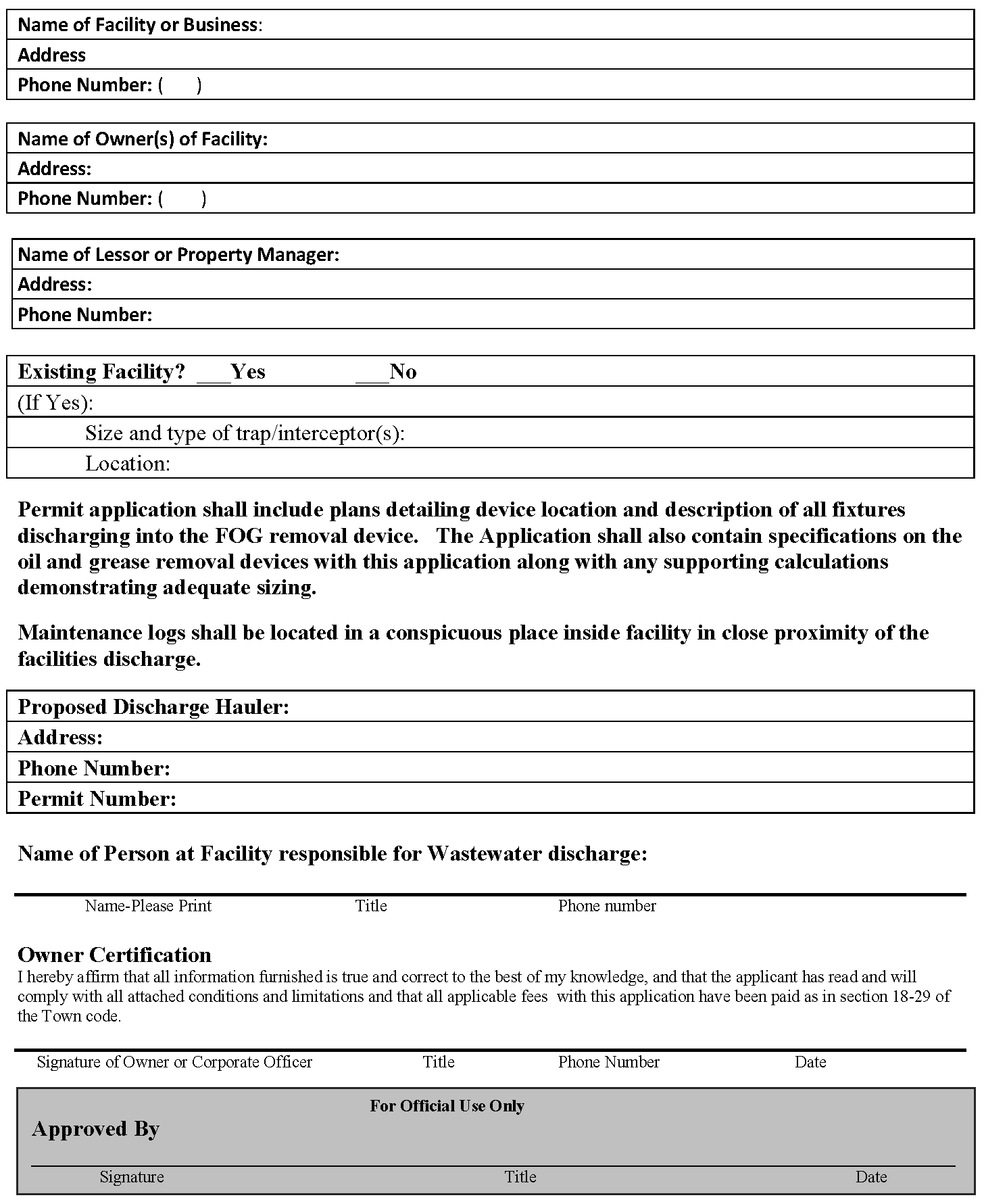 In order to be considered fully completed, the sewer connection application shall state in the blanks designated the applicant's name, street address (and, if different, mailing address), telephone number, fax number (or "None" if the applicant does not have a fax number), e-mail address (or "None" if the applicant does not have an e-mail account), the street address at which the proposed project covered by the application is located, a parcel ID number (i.e., tax map number), the I/I remediation basin in which the proposed project is located (determined using the I/I remediation basin map - Figure 13.05-1 of Article 13), the estimated date for completion or occupancy of the new or modification development construction, and an estimate of the pre-construction/modification sewage flow rate (including peaking factor) and post-construction/modification sewage flow rate (including peaking factor).