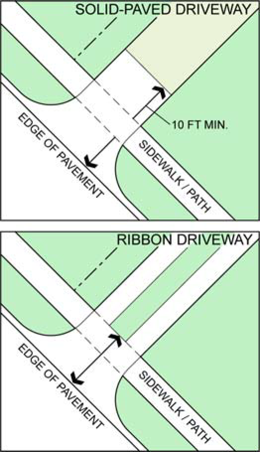 All driveways that cross an existing sidewalk shall be paved from the edge of street pavement to at least ten feet from the back of the sidewalk, regardless of whether the parking on-site is required to be paved or not. See illustration at right. Ribbon-type driveways shall be solid-paved from the back of sidewalk to the edge-of-pavement.