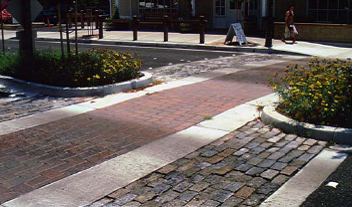 Walkways should consist of special pavers or scored concrete with modules that should not exceed three (3) feet in width.