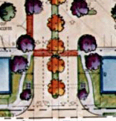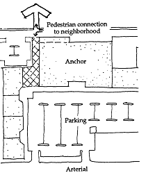Off-Site Connections. Each project is encouraged to have its own identity, yet any site development should be integrated with adjacent compatible uses to provide functional and aesthetically designed vehicular and pedestrian circulation. Where complementary land uses are close (e.g. residential & employment) and conditions make it feasible, vehicular connections and pedestrian paths to neighborhood-serving retail are encouraged. Pedestrian paths should be well lighted and have entries or windows facing them. For additional security, they may be gated at certain hours and designed to accommodate emergency vehicles (while discouraging other vehicles).