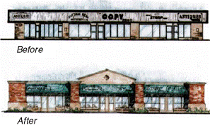 Blank walls should be avoided. Consider utilizing windows, trellises, wall articulation, arcades, changes in materials or other features to break up the massing of the building.