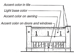 Door and window trims, awnings, and wall tiles should be used to provide an opportunity for color that adds interest and texture to storefronts or building bases. Color of trim should be coordinated with the wall colors.