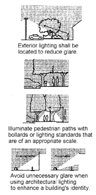 Lighting. Effective lighting provides safety and direction for vehicles and pedestrians, visibility and security for businesses, while enhancing architectural building and landscape details. These guidelines apply to on-site lighting of parking areas and lights associated with the exterior of the building. Lighting types could include pole lights, spotlighting, wall-mounted sconces, parking and landscape lighting.