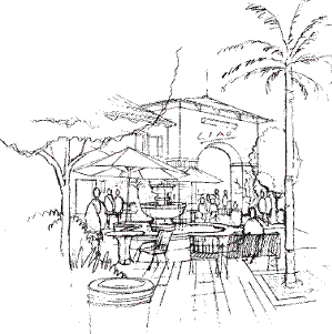 Features used within a plaza shall be consistent with the architectural style of the project. Plazas are encouraged where high-levels of pedestrian-activity are expected, such as adjacent to major entrances and food services like delis, restaurants and bakeries. Building entries and windows should look onto plazas to enhance activity and security.